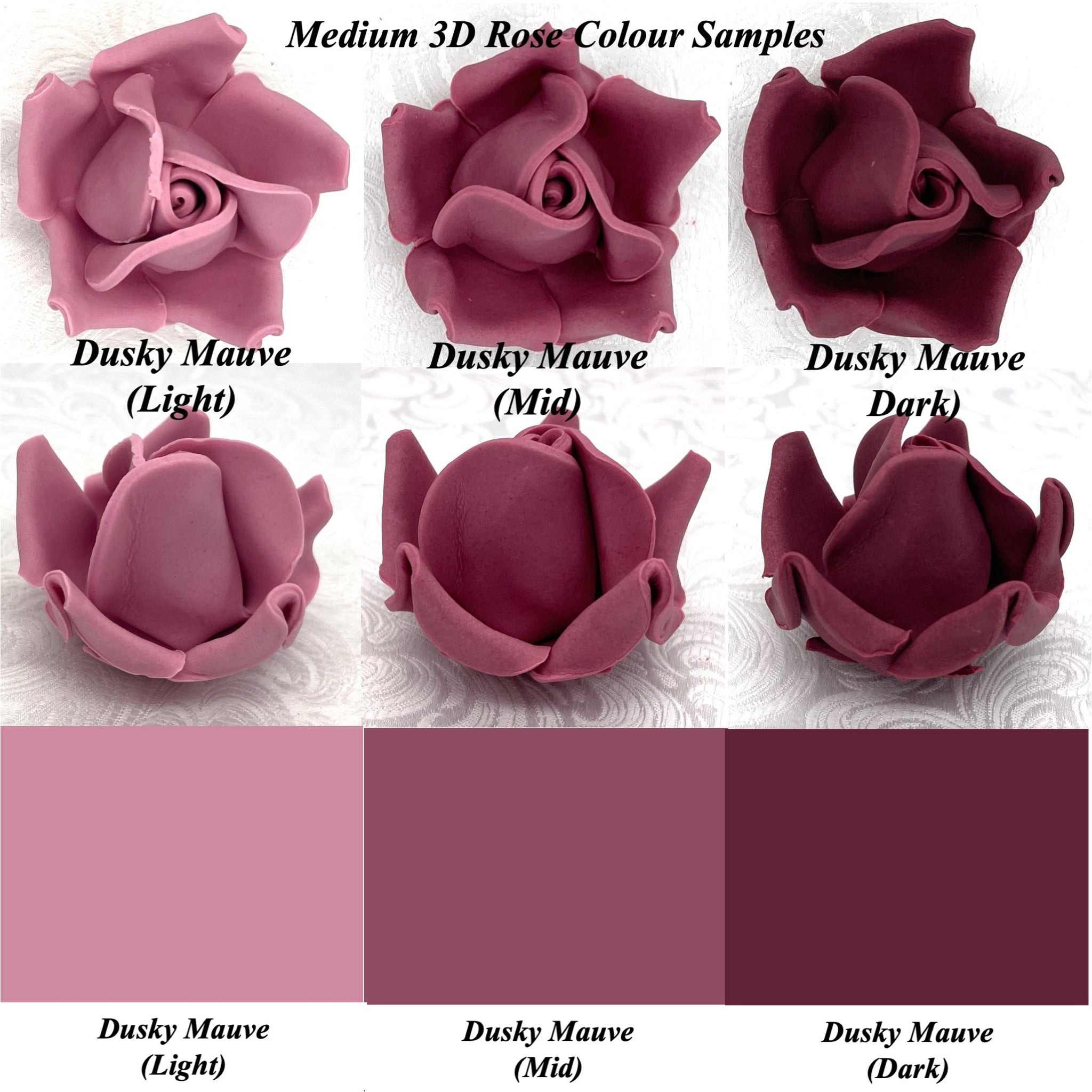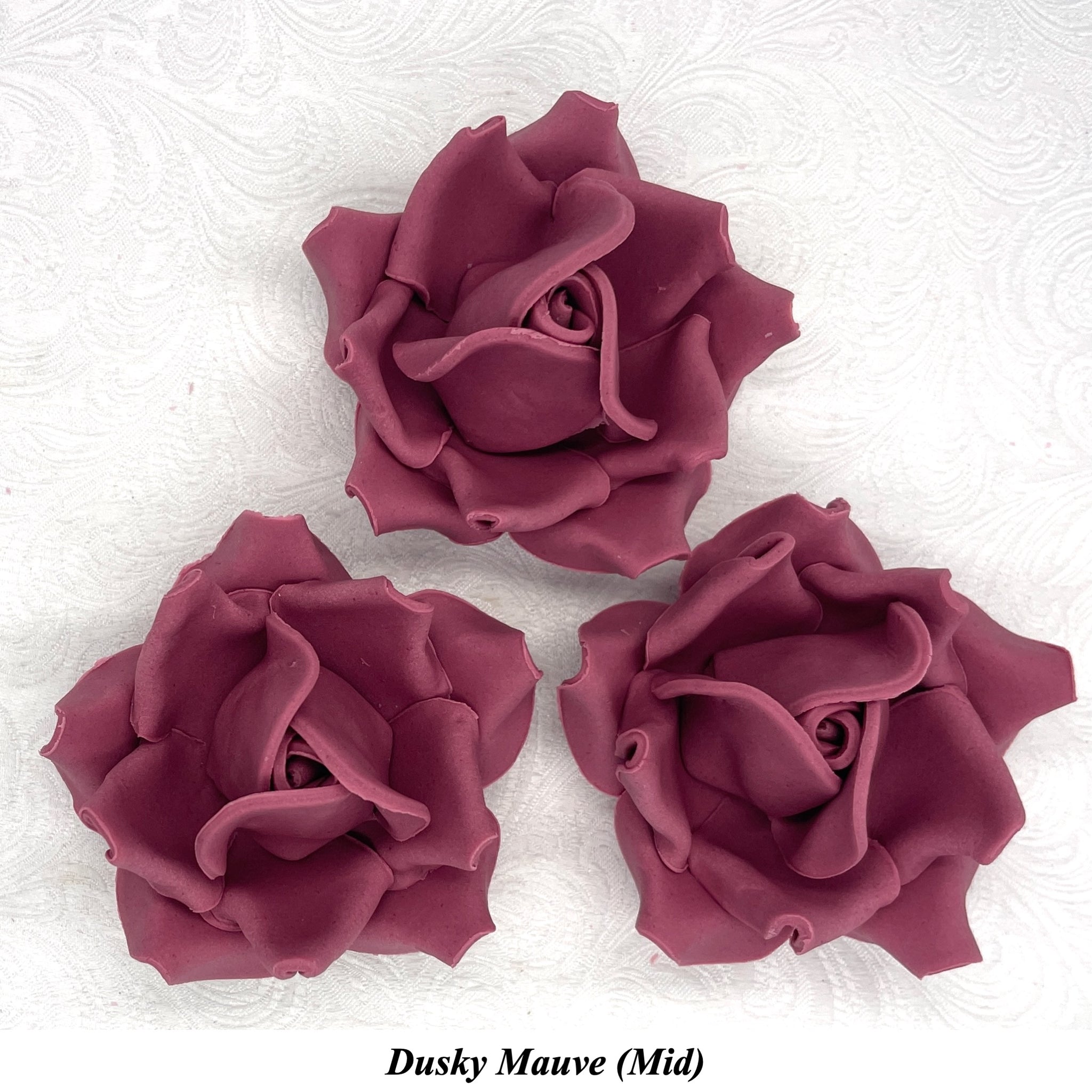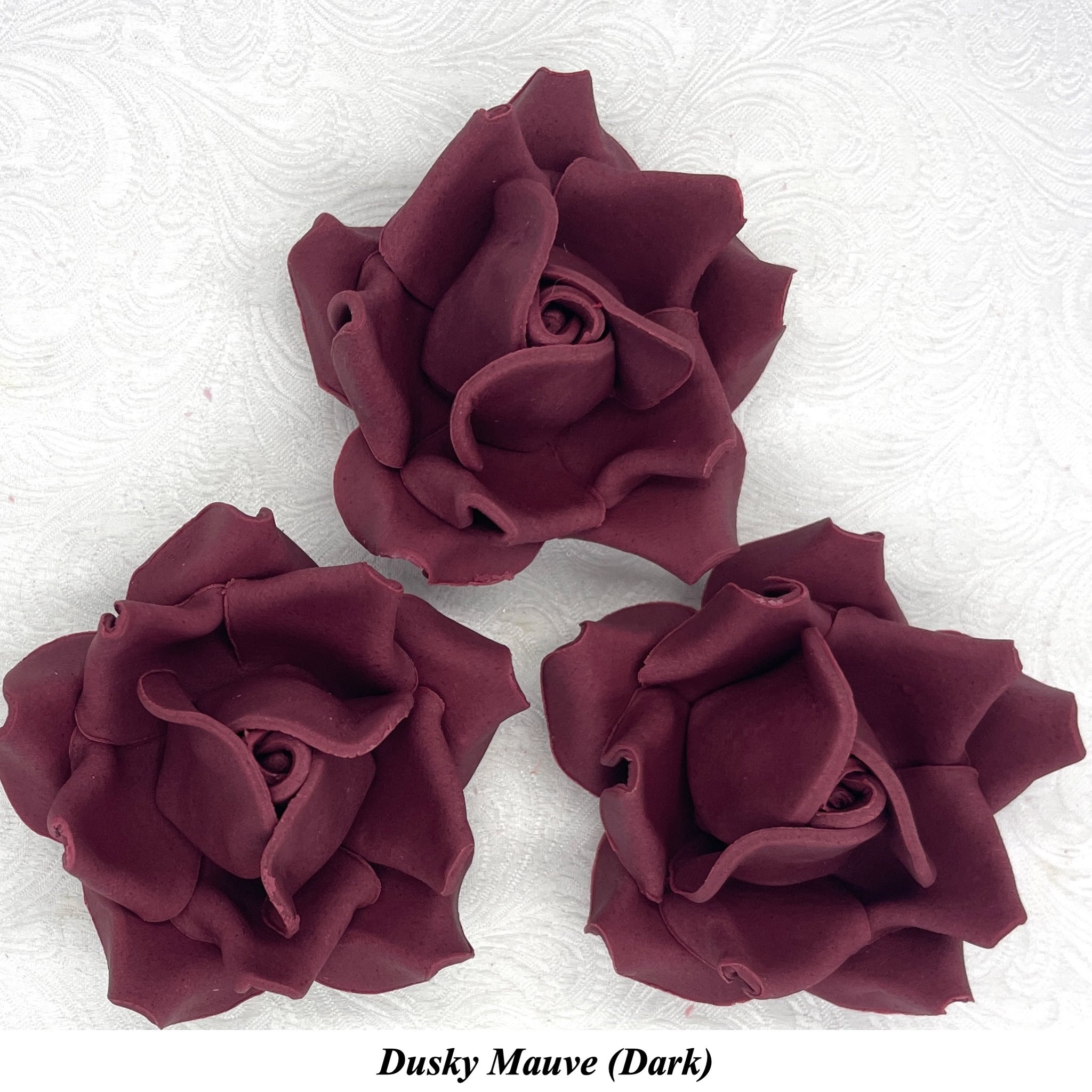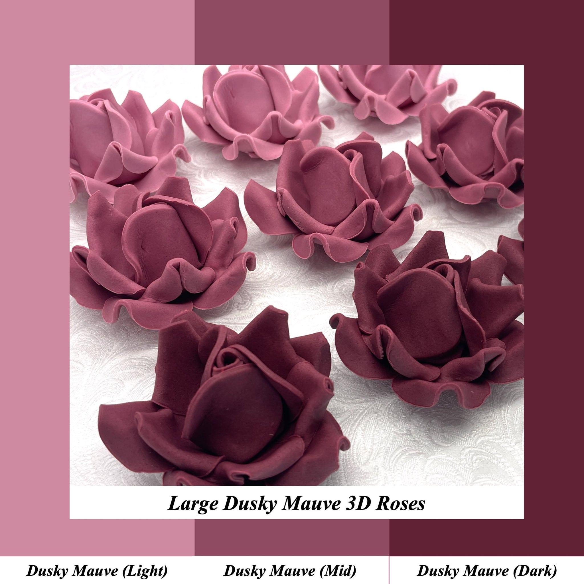 This listing is for Large 3D Sugar Roses in Dusky Mauve (Light), Dusky Mauve (Mid) or Dusky Mauve (Dark) shades.